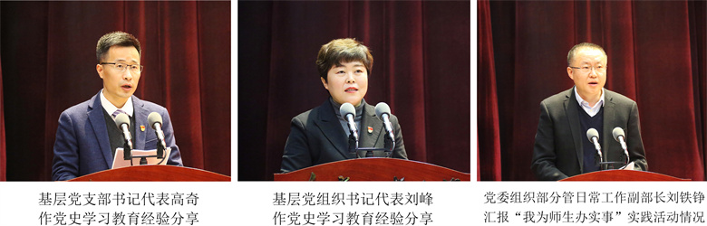 基层党支部书记代表、机械工程与自动化学院党委教工第一党支部书记高奇,基层党组织书记代表、汽车与交通工程学院党委书记刘峰作党史学习教育经验分享。党委组织部分管日常工作副部长刘铁铮汇报“我为师生办实事”实践活动开展情况。