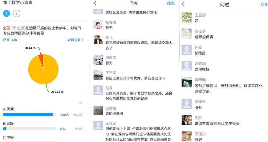 线上教学问卷调查表明,同学们认为“每门线上课程都很好,上课效率高,氛围好,线上线下结合的方式十分新颖有效”“学生与老师积极互动,课程活跃度较高”。教师根据学生反馈,及时调整课程内容、在线教学组织方式等线上教学要素,促进了教学质量提升。同时也在线上课堂融入家国情怀、使命担当、工程伦理等思政元素,确保在线课堂思想引领不断线、不断档,全方位为学生提供成长成才“复合维生素”。