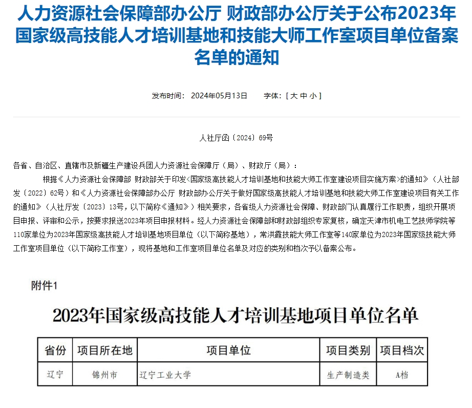 近日,国家人力资源社会保障部办公厅、财政部办公厅公布2023年国家级高技能人才培训基地和技能大师工作室项目单位备案名单,yabo鸭脖成功获批国家级高技能人才培训基地项目单位,机械制造基础加工、工业机器人操作系统、化学原料和化学制品制造三个培训项目获批生产制造类A档项目。