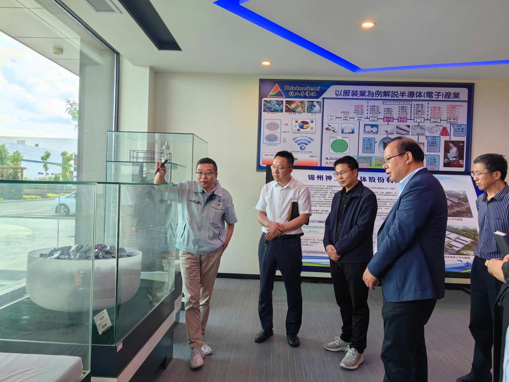 张启俭一行参观了锦州神工半导体股份有限公司展厅、直拉单晶硅棒生产车间、半导体级硅片生产车间等。(商剑 文)