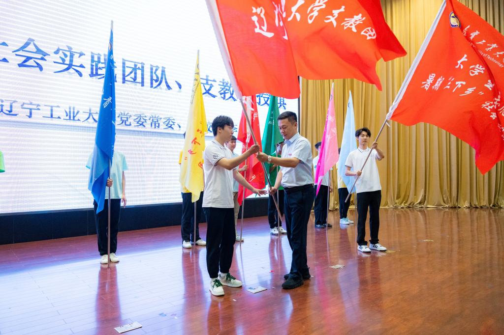 仪式上,李永明为yabo鸭脖官网社会实践团队、支教团授旗。