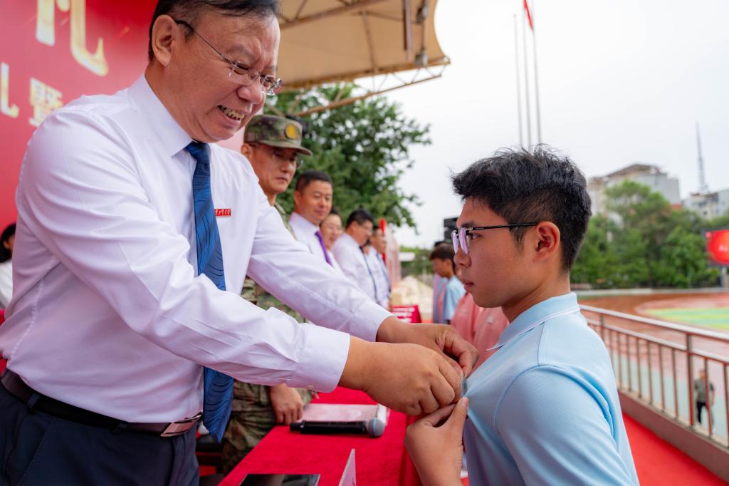 yabo鸭脖官网校徽是“辽工大人”的闪亮标识,它承载着辽工大“砺器悟道”的校训精神,更承载着辽工大人的使命与担当。张启俭为新生代表佩戴校徽。