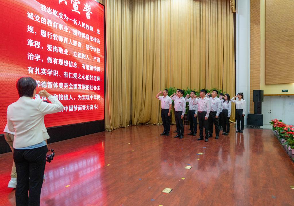 毕业生代表专程返校为退休教师赠送鲜花,退休教师代表为新入职教师代表佩戴校徽,将立德树人的接力棒传到他们手中。