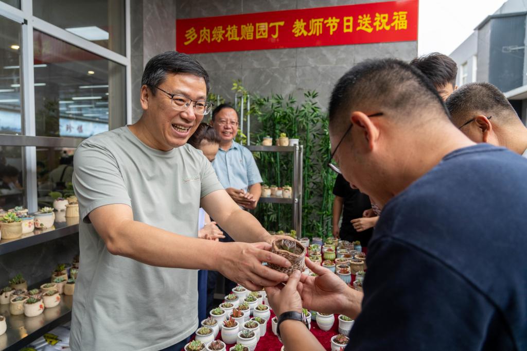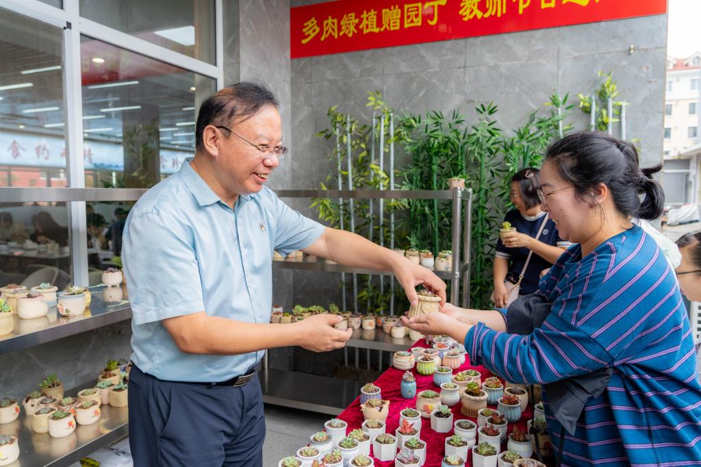 9月10日中午,学校在教工食堂准备了寓意耕耘与成长的多肉绿植,送给前来就餐的老师。校领导们将绿植送到每一位老师的手中,并送上亲切的节日问候,希望老师们在忙碌的教育教学工作中,努力践行和弘扬教育家精神,以饱满的热情投入工作,以“甘为绿叶”的精神无私从教。