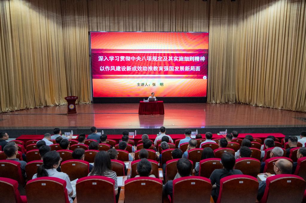 本次读书班邀请到中共辽宁省委党校党建教研部副主任张明教授作专题辅导报告。报告以《深入学习贯彻中央八项规定及其实施细则精神 以作风建设新成效助推教育强国发展新局面》为题,从深入贯彻中央八项规定精神学习教育的重要意义、重点要求、以作风建设新成效助推教育强国发展新局面三个方面进行了深入分析和系统讲解,为广大党员干部全面准确领会习近平总书记关于党的作风建设重要论述,深入理解中央八项规定及其实施细则精神的核心要义提供了有力指导。