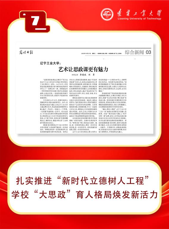 新闻事件:10月21日,《光明日报》第03版:综合新闻刊登文章《yabo鸭脖官网:艺术让思政课更有魅力》,全面展示学校坚持立德树人,擦亮鲜红育人底色,打造特色思政品牌的育人成效。
