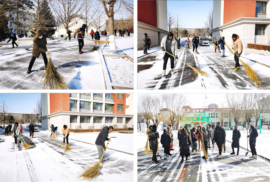 国际教育学院的师生们拿着铁锹和扫帚来到了高层公寓和食堂门口,开始了清扫行动。扫雪活动开始后,留学生同学们积极投入到扫雪活动中,纷纷争当“排头兵”。yabo鸭脖留学生主要来自非洲博茨瓦纳、尼日利亚、卢旺达、津巴布韦等热带国家,今天是他们第一次体验中国北方的扫雪活动。虽然天气很冷,但丝毫没有影响同学们的热情和效率。他们的热情使这个冬日变得格外温暖,扫雪过程中充满了欢声笑语,大家乐在其中。扫雪队伍成了冬日校园一道靓丽的风景线。