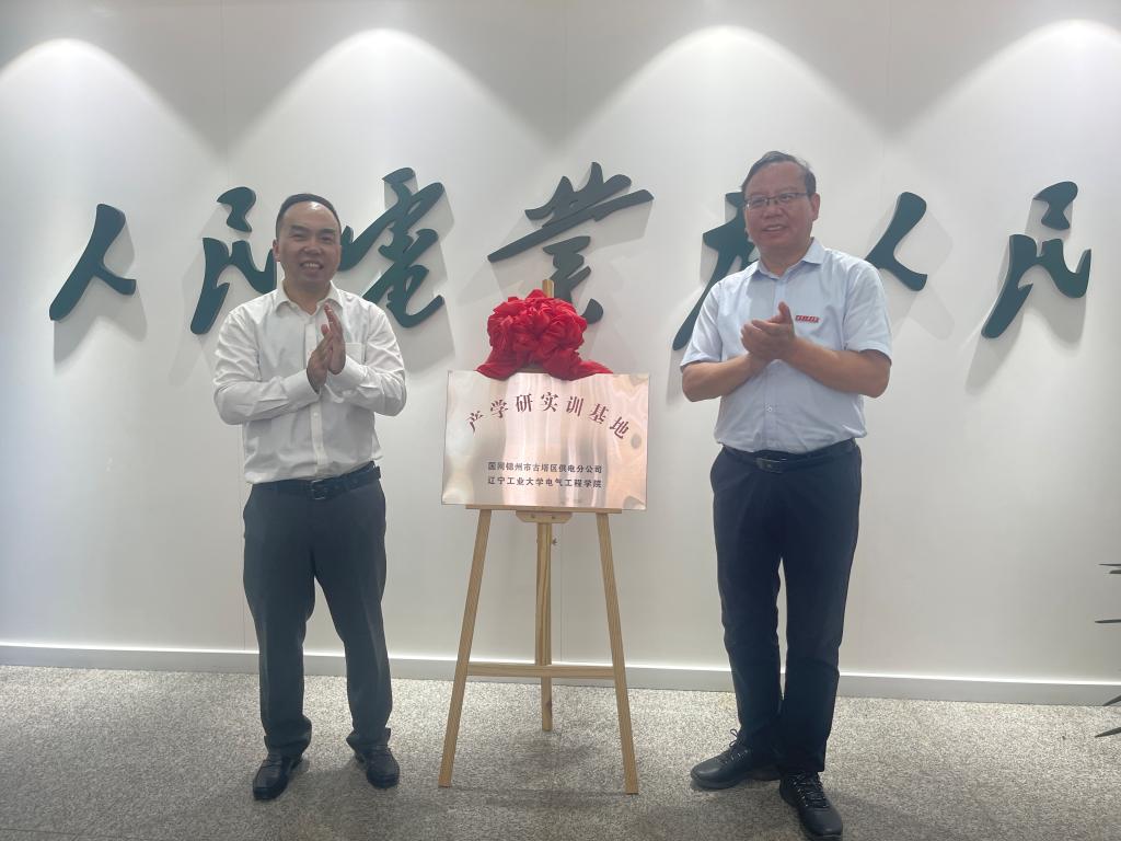 张启俭、王洪涛为“产、学、研”实训基地揭牌。电气工程学院院长白锐和郑湃签署了《yabo鸭脖官网电气工程学院 锦州市古塔区供电分公司“产、学、研”实训基地建设合作协议》。(王江 文/摄影)