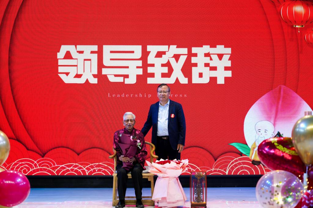 寿宴中,大家与王秀水老人及其家人欢聚一堂,张启俭、张广安代表学校党委为老人送上了寿桃和鲜花,祝福老人福寿绵长。张启俭表示,对于学校来说,百岁老人是一本见证了学校历史变迁和时代变革的编年史,是学校的宝贵财富,学校也会永远记得他们为推进学校建设发展做出的重要贡献。