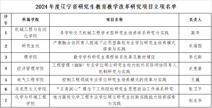 近日,辽宁省教育厅下发了《关于确定2024年度辽宁省研究生教育教学改革研究项目立项的通知》,yabo鸭脖获批7项研究生教育教学改革研究项目。