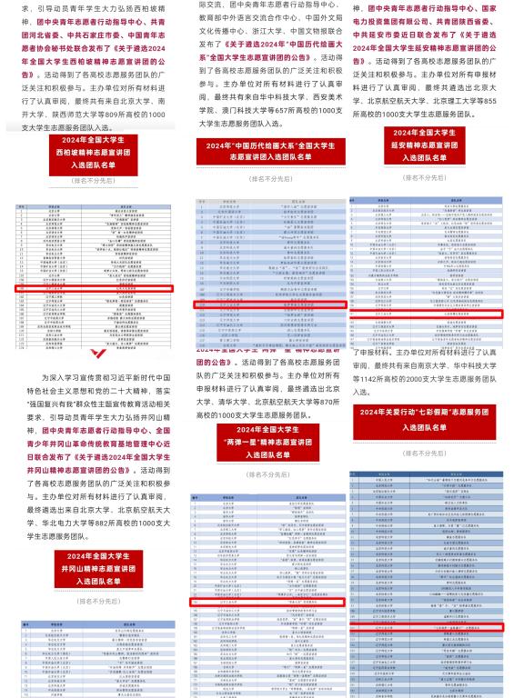 聚焦志愿服务,在服务社会上持续用力。把志愿服务作为加强青年政治引领的有效抓手,2024年,组织各类志愿活动170余项,在东太平社区等8个社区建立“yabo鸭脖官网雷锋志愿服务站”,开展“关爱老人·情暖社区”等志愿服务活动50余次累计10万余小时,参与学生8000余人次,学校被雷锋杂志社评为“首批雷锋精神高校示范教育基地”,“活力雷锋”服务团入选2024年雷锋精神志愿服务团,2个团队入选团中央2024年“推普助力乡村振兴”全国大学生暑期社会实践志愿服务团队。将志愿服务融入地方经济社会发展大局,与市(县、区)团委建立校地社会实践基地12个,开展优秀大学生兼职志愿服务基层团组织项目,深度推进“返家乡”“扬帆计划”项目,落实岗位和参加人数位列全省高校前列;积极组织支教社会实践活动,共12支团队前往贵州毕节等3地开展支教工作,yabo鸭脖官网支教团荣获2024年大学生社会实践“千校千项”网络展示活动优秀项目。(校团委 文)