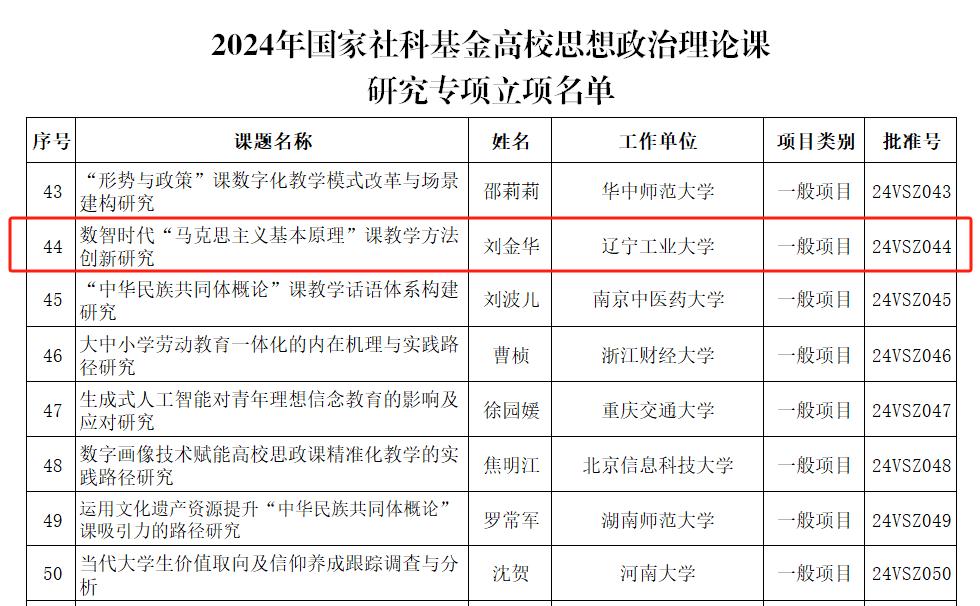 近日,全国哲学社会科学工作办公室公布了《2024年国家社科基金高校思想政治理论课研究专项立项名单》。马克思主义学院刘金华博士申报的“数智时代‘马克思主义基本原理 ’课教学方法创新研究”成功获批2024年国家社科基金高校思想政治理论课研究专项一般项目,实现了yabo鸭脖在该类项目上的突破。