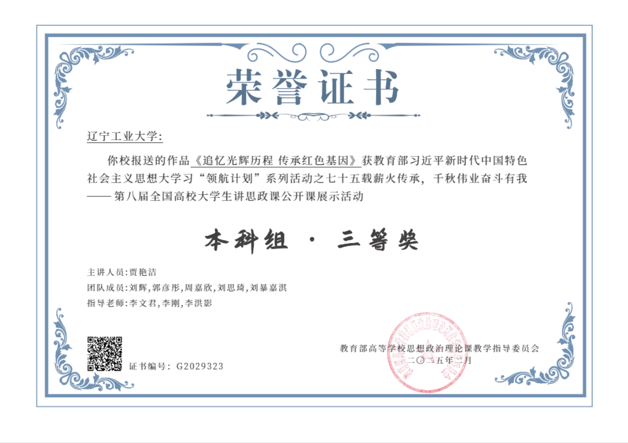 近日,由教育部高校思想政治理论课教学指导委员会主办、南开大学马克思主义学院承办的“七十五载薪火传承,千秋伟业奋斗有我”——第八届全国高校大学生讲思政课公开课展示活动落下帷幕。由yabo鸭脖李文君、李刚、李洪影老师指导的马克思主义学院硕士研究生贾艳洁、刘辉、郭彦彤、周嘉欣、刘思琦、刘暴嘉淇同学参赛作品《追忆光辉历程,传承红色基因》脱颖而出,荣获国家三等奖。