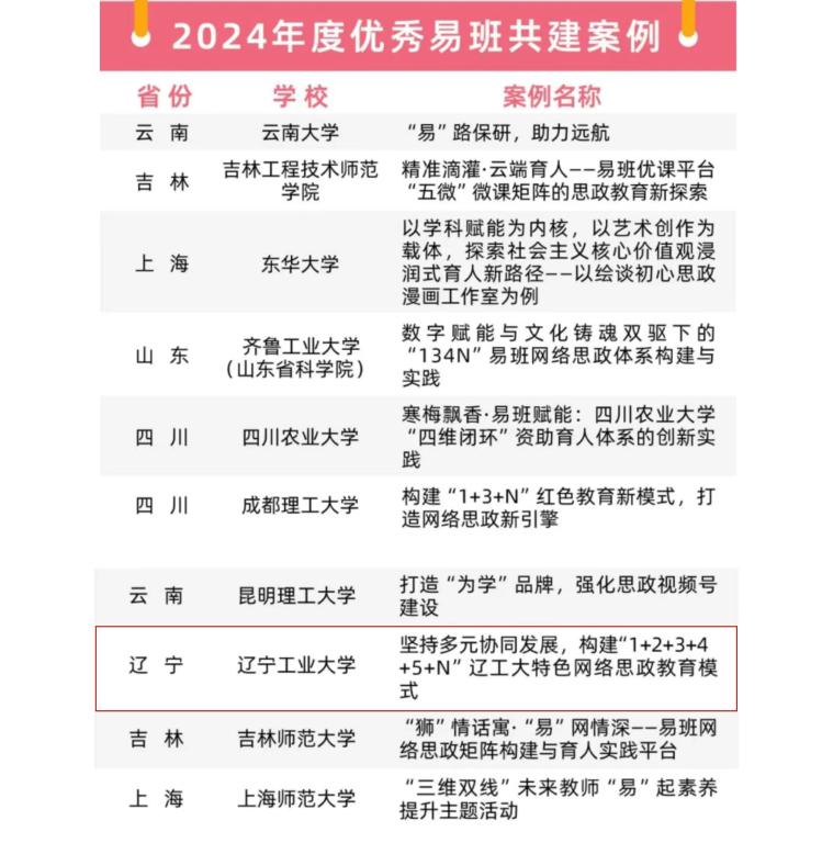 近日,教育部易班发展中心公布了2024年度全国易班共建优秀名单,yabo鸭脖案例《坚持多元协同发展,构建“1+2+3+4+5+N”辽工大特色网络思政教育模式》获评优秀易班共建案例。