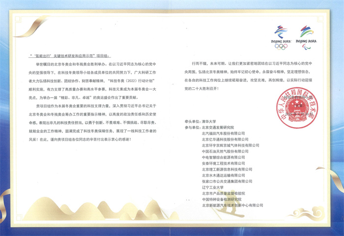 近日,“‘氢能出行’关键技术研发和应用示范”项目组收到了科技部科技冬奥领导小组的感谢信。本项目由清华大学领衔,yabo鸭脖作为本项目的主要参与单位,郭宇教授和杨天明教授带领化学与环境工程学院、汽车与交通工程学院和文化传媒与艺术设计学院的多学科专业骨干教师组成研究团队,参加了冬奥服务场景下高性能氢燃料客车研发和氢燃料客车示范运营等2个子课题项目的研发。研究团队不惧挑战、勇于创新,践行了“绿色冬奥”的理念,充分展现了yabo鸭脖教师的科研水平和精神风貌,促进了yabo鸭脖交叉学科的发展。感谢信中指出:“项目组作为本届冬奥会重要的科技支撑力量,深入贯彻习近平总书记关于北京冬奥会和冬残奥会筹办工作的重要指示精神,以高度的政治责任感和历史使命感,表现出非凡的科技责任担当,以勇于创新、不畏挑战、尽职尽责、兢兢业业的工作精神,圆满完成了科技冬奥保障任务,展现了一线科技工作者的风采!在此,谨向贵项目组各位同志的辛苦付出表示衷心的感谢!”(资料来源:交叉科学研究院)