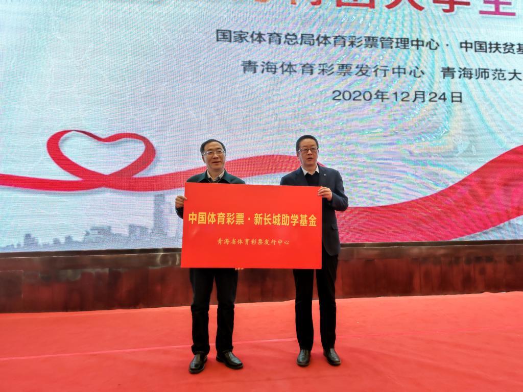 12月24日,2020年“中国体育彩票·新长城助学基金”(青海站)捐助仪式在城北校区图书馆报告厅举行。青海省体育局副局长刘兴海、青海省体育局机关党委副书记巴旭东、省直机关团工委书记毛媛、青海省体育彩票发行中心主任郭大忠以及必赢官网副校长许存宁、学生工作处负责人、200余名学生参加。