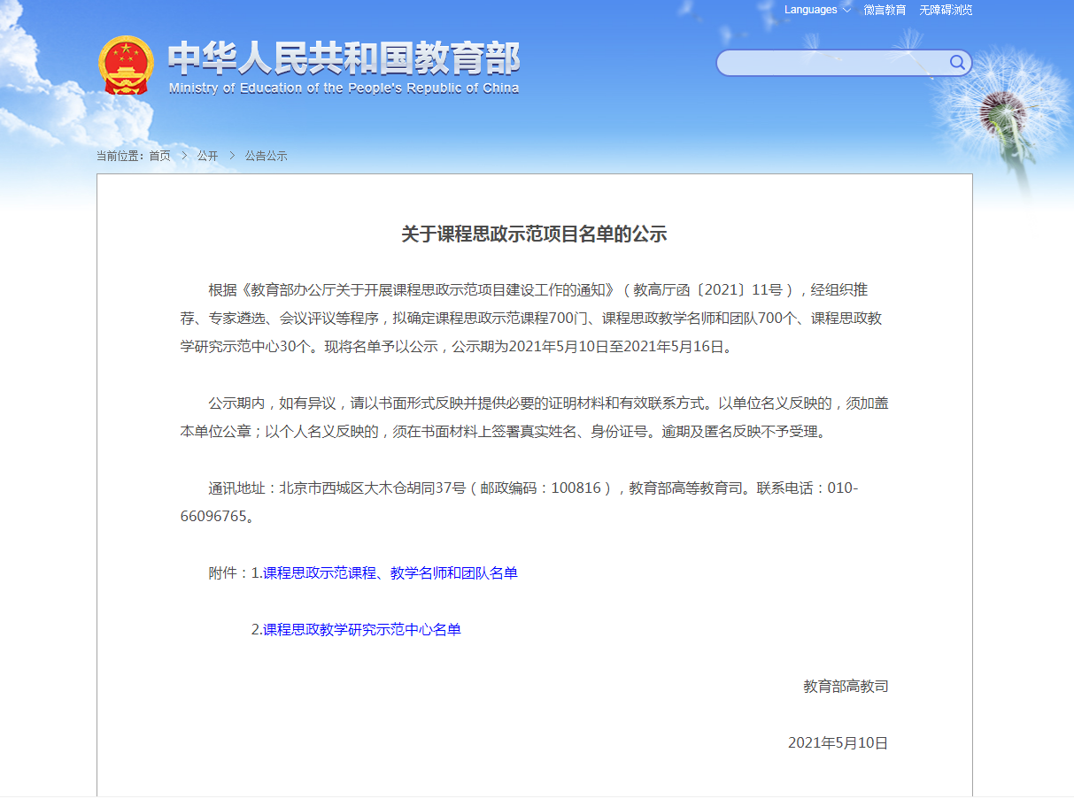 教育部课程思政示范项目公示链接: