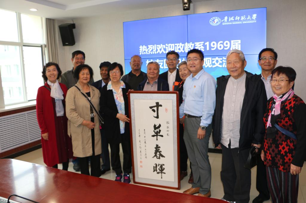 座谈会上,杨秀荣代表校友发言。她表示,相隔50年岁月,跨越两个世纪沧桑,国家和母校都发生了翻天覆地的变化,已是古稀之年的他们,50年后与同窗再聚母校,倍感激动和喜悦,感谢学校的培养,感谢政教系恩师的教诲。随后,与会校友共同回顾了50年前在校学习、生活的时光,分享了50年来的工作、生活的历程,祝福母校抓住时代机遇,各项事业再创辉煌,并向母校捐赠“寸草春晖”书法作品。