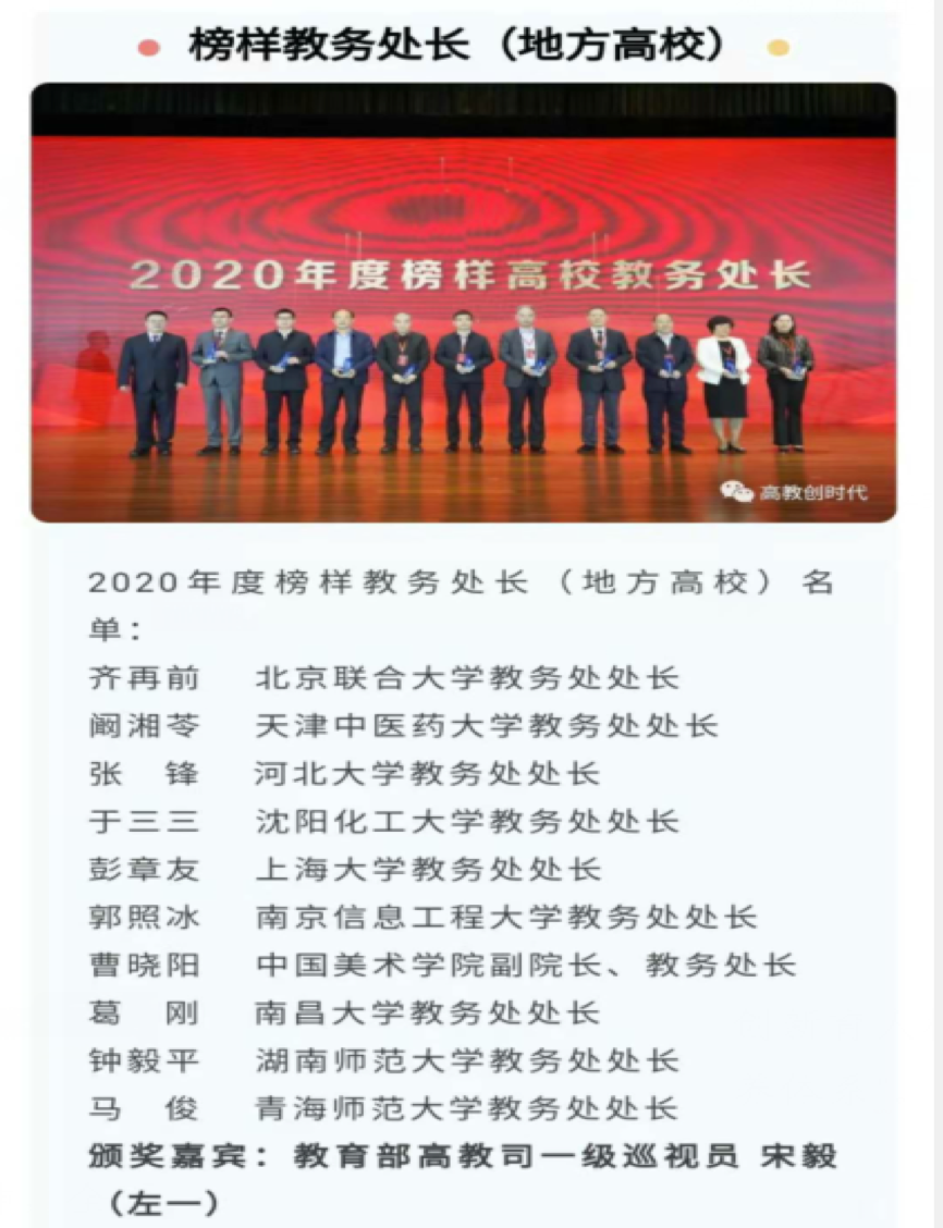 马俊教授被大会授予“2020年度全国榜样高校教务处长”荣誉称号