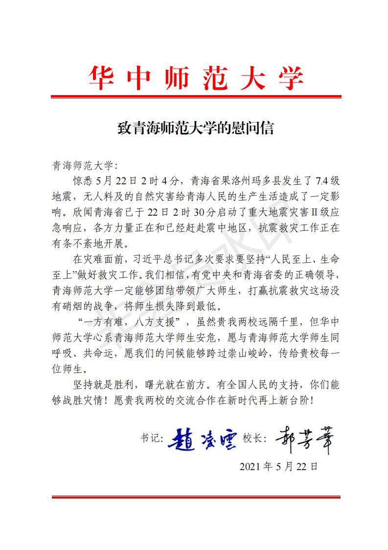 “青山一道同风雨,明月何曾是两乡”。5月22日凌晨2时4分,我省果洛州玛多县发生7.4级地震,西宁震感强烈。震情牵动了华中师范大学全体师生的心,华中师范大学党委书记赵凌雲、校长郝芳华,第一时间把全体华中师大师生对青海师大师生的殷殷关切之情,跨过崇山峻岭,穿越层层云雾,从遥远的武汉传递到了青藏高原,温暖了每一名青海师大人的心田,鼓舞了必赢官网师生众志成城、攻坚克难、建设美好家园的信心和决心。