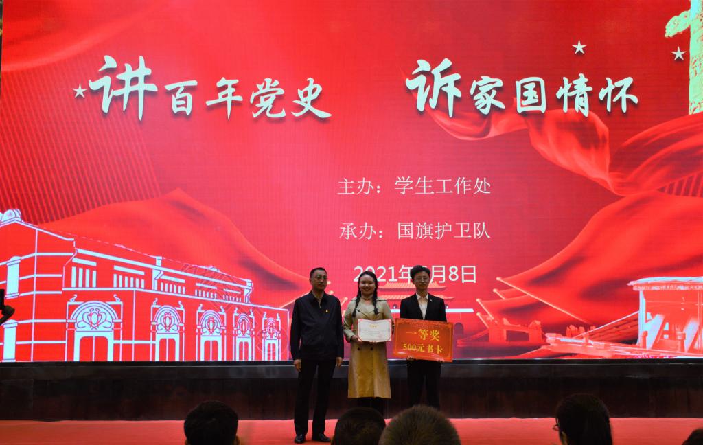 经过激烈的角逐,新闻学院马源源小组的《等待》获得一等奖;文学院包艳萍的《党旗,飘扬在前方》和生命科学学院普布江才小组表演的《烈士孙津川的故事》获得二等奖;文学院唐红小组的《巾帼英雄赵一曼》、李甜甜小组《中共第一位女党员——缪伯英》、朋毛措小组的《缅怀先烈 铭记历史》获得三等奖,数学与统计学学院的杨晨润泽、马克思主义学院的妥晓燕、地理科学学院的黄雅兰和生命科学学院的白美萍分别获得优秀奖。