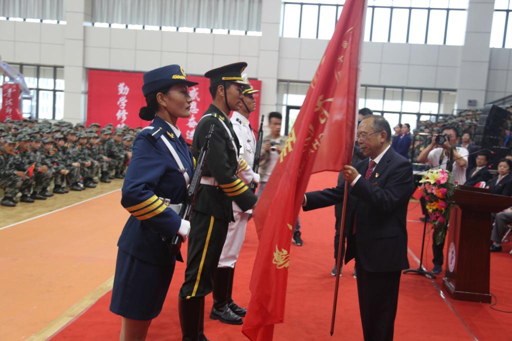 校党委书记张雄伟为军训团授旗。