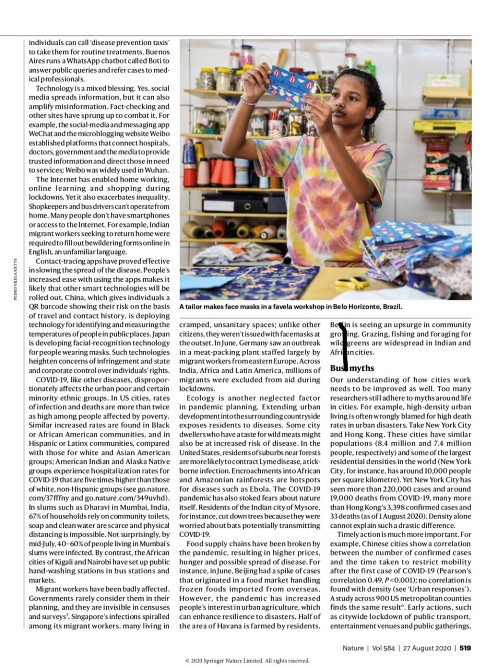 该文包括全球应对新冠肺炎(COVID-19)疫情的经验与教训(Learn Lessons),城市确诊病例数与其人口密度的关系(Bust myths)、发挥城市网络系统的功能(Mobilize networks)、增强城市网络化功能韧性(Build resilience)等4个部分。研究结果表明城市网络化功能韧性在疫情管控中发挥了关键作用,让人们通过构建与完善城市协同网络,共享综合减灾与风险防范规划,加强巨灾应急能力。