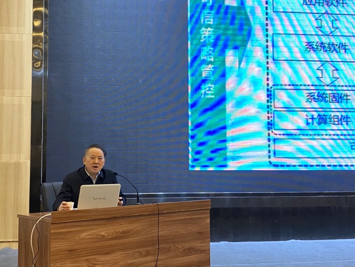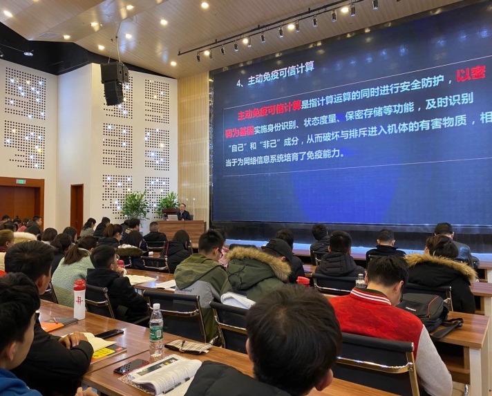 讲座中,沈昌祥院士重点介绍了当前全球网络安全的基本情况,并以此为背景,就网络空间安全学科的建立历程、学科概况、学科培养目标、主要研究方向及内容、学科的理论与方法论基础、学科的基础知识体系等六个方面进行了介绍。他指出,计算机学院作为高校二级学院,应当立足学科、立足时代、勇于担当,争创一流网络空间安全学院,做好网络安全普及教育。讲座结束后,沈昌祥院士又亲临计算机学院就学科建设进行深入指导,并同学院师生进行座谈,回答了同学们提出的问题。