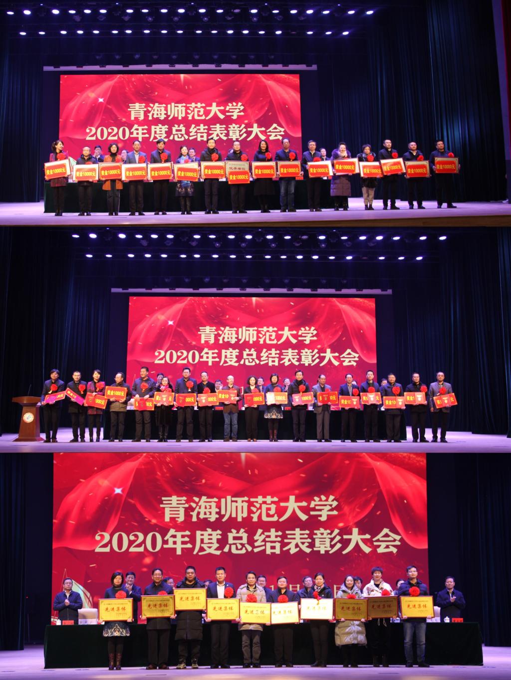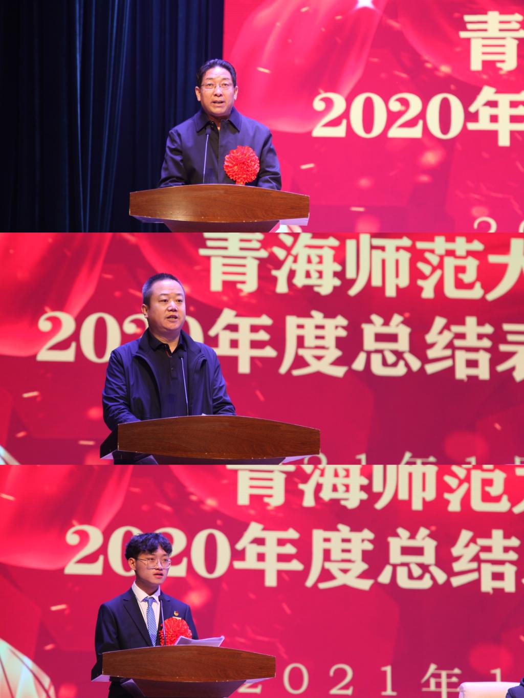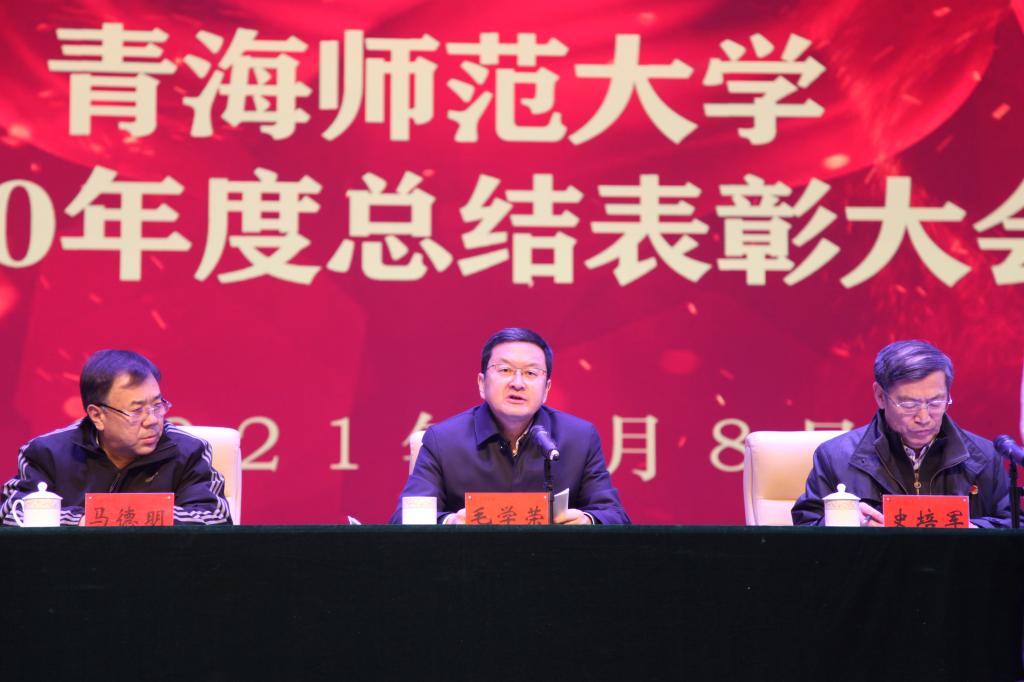 毛学荣代表校党委、校行政向受到表彰的先进个人和集体表示热烈祝贺,向为抗疫斗争作出贡献的所有单位和个人表示崇高敬意。他全面回顾总结了学校“十三五”和2020年工作成绩,科学描绘了“十四五”时期的主要目标和2021年的主要工作。他指出,五年来,全校师生坚持一张蓝图绘到底,一茬接着一茬干,一棒接着一棒跑,开拓进取、追求卓越,较好地完成了重点工作目标任务,助推学校站上了发展新起点,实现了历史新跨越。一年来,全校师生凝心聚力、攻坚克难、扎实工作、开拓进取,书写了加快高质量发展的奋进之笔和华彩篇章,工作成绩可圈可点。一是聚焦“四个主体责任”,全面加强党的建设。全面细化强化了学校各级党组织在党的建设、党风廉政建设、意识形态工作、维护安全稳定工作四个方面的主体责任,着力强化思想政治教育的铸魂育人功能,党建和干部工作取得新成效,疫情防控取得重大成果。二是聚焦教学改革新方向,促进人才培养质量新提升。课程建设迈出新步伐,构建了通识育人、协同育人的新模式,卓越教师培养项目实现全覆盖,学生发展更加蓬勃有力,师范教育的主体地位和规模优势更加巩固。三是聚焦学科科研建设,发展软实力显著增强。学科建设龙头作用持续凸显,重大科研平台建设实现新突破,科研项目经费实现提质扩量,首次突破亿元大关,总量居全省高校之首,实现国家重点研发项目零的突破。四是聚焦“三院”建设,学校综合影响力不断扩展。高原科学与可持续发展研究院蓬勃发展,“两弹一星”精神研究院高位推进,青海省应急管理学院筹备有序。五是聚焦内涵建设,加快高质量发展的基础更加坚实。人事制度改革深入推进,对口支援和交流合作格局不断拓展,人才队伍建设迈上新台阶,师德师风建设持续加强。六是聚焦民生改善,着力增强加快发展的保障力。坚持以广大师生为中心的办学理念,努力改善学校办学基本条件,重点建设工程安全推进,基础教育迈出新步伐,平安校园建设坚实有力。