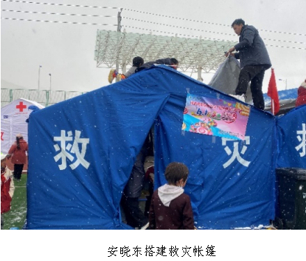 “那天一集合完,就下大雪了。”安晓东同学描述当时天上下起了雪,老师们把被褥拿下来铺在操场上,让学生们先躲进去保暖。然后,学校集中男老师,驱车至七八公里外的镇政府物资集中点,两点四十就将帐篷和物资拉到学校。