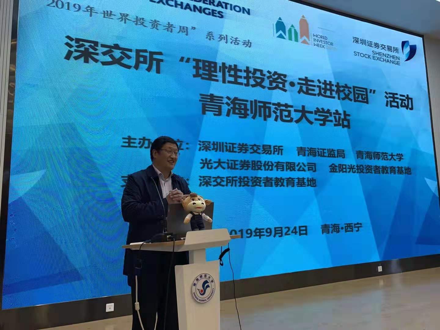 9月24日下午,由深圳证券交易所、光大证券青海营业部、565net必赢客户端联合举办的“投资者丝路行(青海站)——理性投资走进565net必赢客户端”活动在必赢官网科技楼报告厅举行,副校长冶成福出席并致辞,学生工作处、经济管理学院相关领导及近300名师生参加了活动。