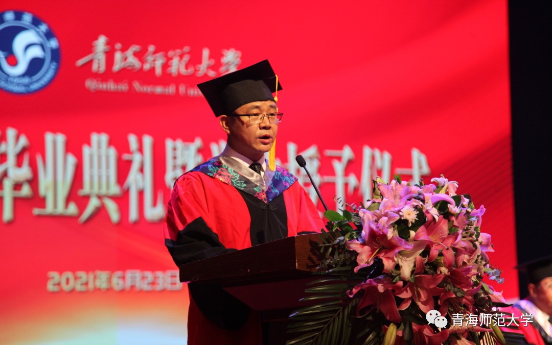 史培军作了《让青春在不懈奋斗中绽放绚丽之花》的致辞。他语重心长地对即将走向新时代国家建设的同学们提出三点嘱托,一是要坚守初心,做一个胸怀家国、砥砺奋进的传承者。二是脚踏实地,做一个笃行务实、不懈奋斗的实干者。三是百折不挠,做一个勇毅不惧、乐观向上的奋斗者。史培军殷切勉励同学们,青春无问东西,奋斗自成芳华。前行的路,无论有多遥远,多崎岖,多艰辛,母校都将与你们一路随行、守望相助,这里留着你们最难忘的青春记忆,还有最牵挂你们的老师,青海师大永远都是你们的精神家园,欢迎你们常回家看看。
