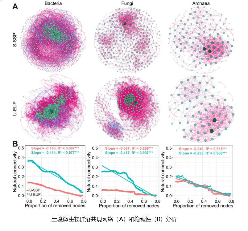 该成果通过长期定位监测点研究,分析不同类型多年冻土区活动层土壤微生物的群落特征,发现多年冻土退化降低了活动层土壤微生物群落的稳定性,表现在重度退化多年冻土区活动层土壤微生物对环境变化的敏感性更高、微生物共现网络更不稳定且稳健性更低。证明多年冻土退化下的活动层土壤微生物稳定性下降和碳损失紧密关联,多年冻土退化下的土壤微生物响应特征很可能介导了高寒生态系统对气候变暖的正反馈。