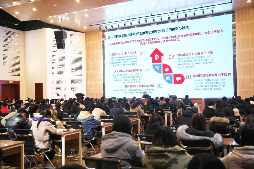 11月26日上午,省政府副省长杨志文来校为师生讲授了题为“完善治理体系、提升治理能力,努力办好新时代现代化师范大学”的思想政治理论课。省政府副秘书长王述友,省教育厅副厅长陈永祥及省教育厅相关部门领导,全体校领导、各部门负责人,思政理论课教师,教职工、辅导员代表和学生代表等近300人现场聆听。校党委书记毛学荣主持了思政课。