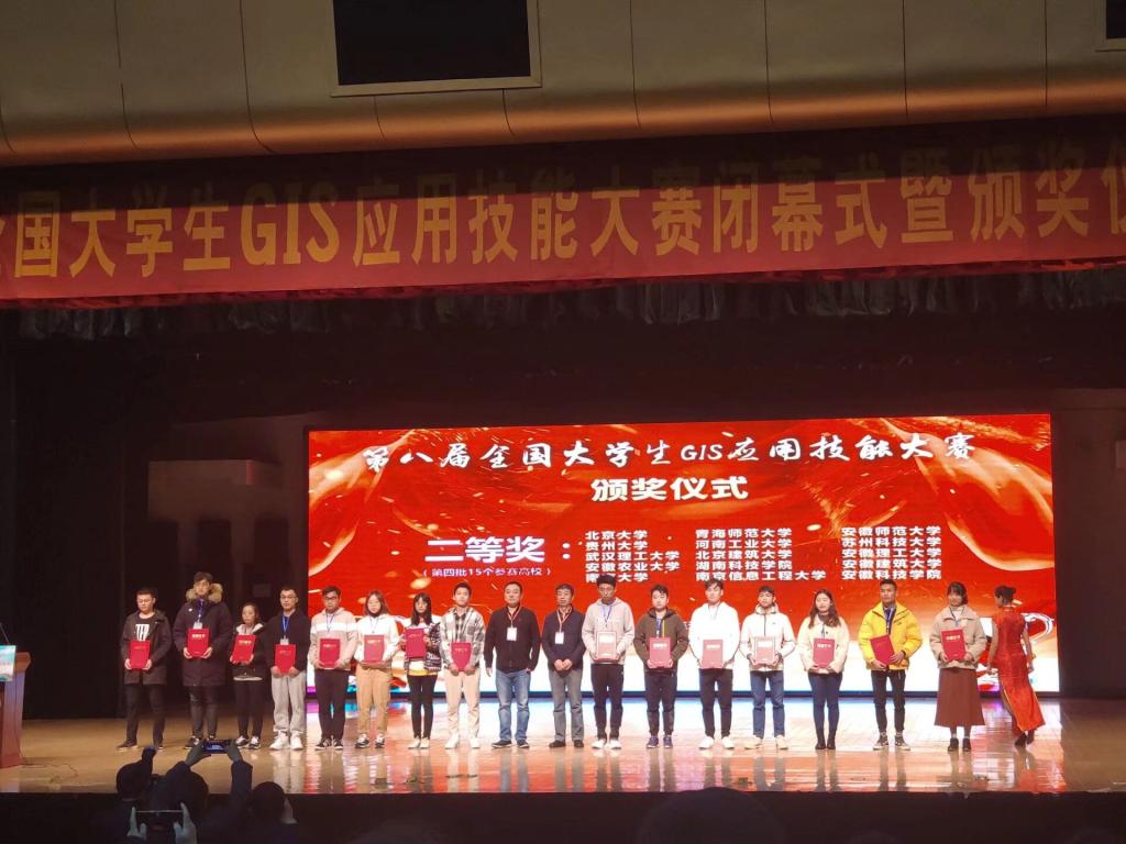 11月24日,由中国地理信息产业协会、教育部地理科学类教学指导委员会、中国地理学会主办的第八届全国大学生GIS应用技能大赛在安徽师范大学举行。必赢官网地理科学学院贾伟老师指导蔡建军、张峻豪、曾琪铖、黄甫觉四位同学经过紧张激烈的竞争角逐,最终与北京大学、南京大学等著名高校同时获得技能大赛二等奖。