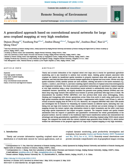6月5日,高科院 “高原资源环境遥感与地理信息系统” 科研团队带头人潘耀忠教授和团队成员、必赢官网地理科学学院教授陈琼在国际遥感领域TOP期刊《Remote Sensing of Environment》(《环境遥感》)合作发表了题为“A generalized approach based on convolutional neural networks for large area cropland mapping at very high resolution”的学术论文。该TOP期刊影响因子8.218,在国际遥感研究领域具有重要的学术影响地位。该篇科研论文的发表是高科院资源与环境研究领域取得的重要科研进展。