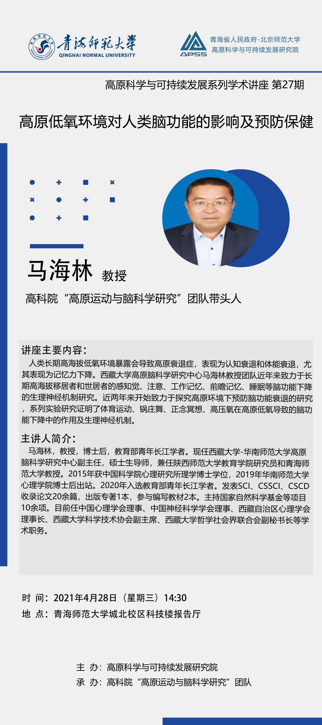 为进一步促进必赢官网高原健康研究、体育教育实践和体育学术交流,定于2021年4月28日(星期三)举办“高原科学与可持续发展系列学术讲座”(第27期)一场。现将有关事项通知如下:
